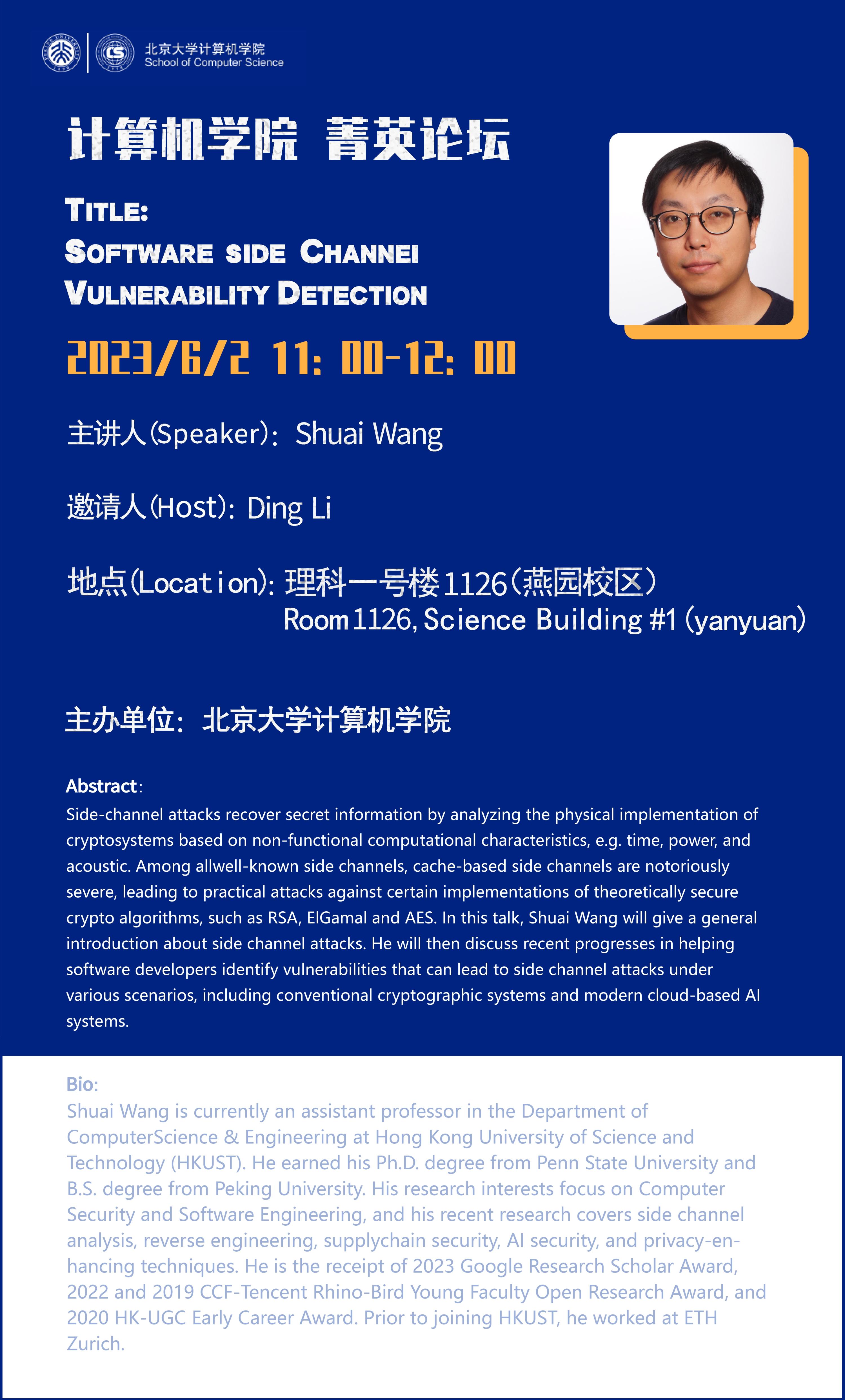 Side-channel attacks recover secret information by analyzing the physical implementation of cryptosystems based on non-functional computational characteristics, e.g. time, power, and acoustic. Among all well-known side channels, cache-based side channels are notoriously severe, leading to practical attacks against certain implementations of theoretically secure crypto algorithms, such as RSA, ElGamal and AES. In this talk, Shuai Wang will give a general introduction about side channel attacks. He will then discuss recent progresses in helping software developers identify vulnerabilities that can lead to side channel attacks under various scenarios, including conventional cryptographic systems and modern cloud-based AI systems.