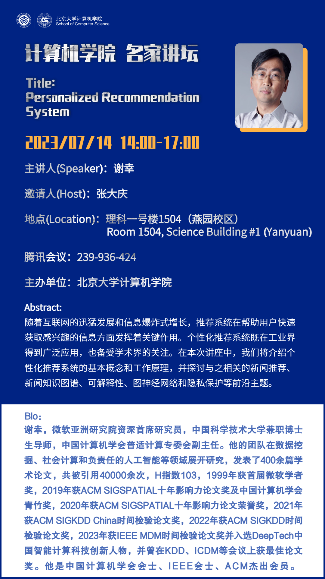 谢幸,微软亚洲研究院资深首席研究员,中国科学技术大学兼职博士生导师,中国计算机学会普适计算专委会副主任。他的团队在数据挖掘、社会计算和负责任的人工智能等领域展开研究,发表了400余篇学术论文,共被引用40000余次,H指数103,1999年获首届微软学者奖,2019年获ACM SIGSPATIAL十年影响力论文奖及中国计算机学会青竹奖,2020年获ACM SIGSPATIAL十年影响力论文荣誉奖,2021年获ACM SIGKDD China时间检验论文奖,2022年获ACM SIGKDD时间检验论文奖,2023年获IEEE MDM时间检验论文奖并入选DeepTech中国智能计算科技创新人物,并曾在KDD、ICDM等会议上获最佳论文奖。他是中国计算机学会会士、IEEE会士、ACM杰出会员。