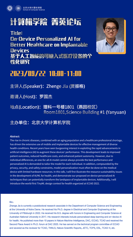 计算机学院系列讲座菁英论坛第17期——On-Device Personalized AI for Better Healthcare on Implantable Devices