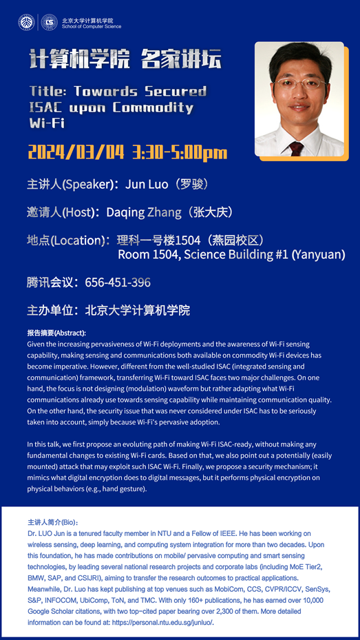 计算机学院系列讲座名家讲坛第11期——Towards Secured ISAC upon Commodity Wi-Fi