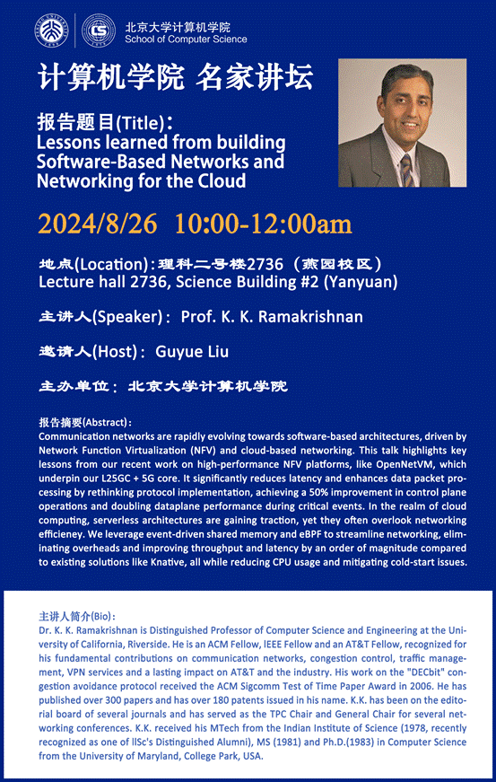 主讲人 (Speaker):Prof. K. K. Ramakrishnan (University of California, Riverside, ACM、lEEE、AT&T Fellow)