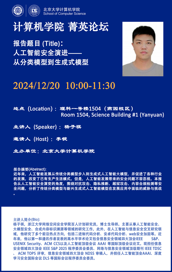 计算机学院系列讲座菁英论坛第39期——人工智能安全演进——从分类模型到生成式模型