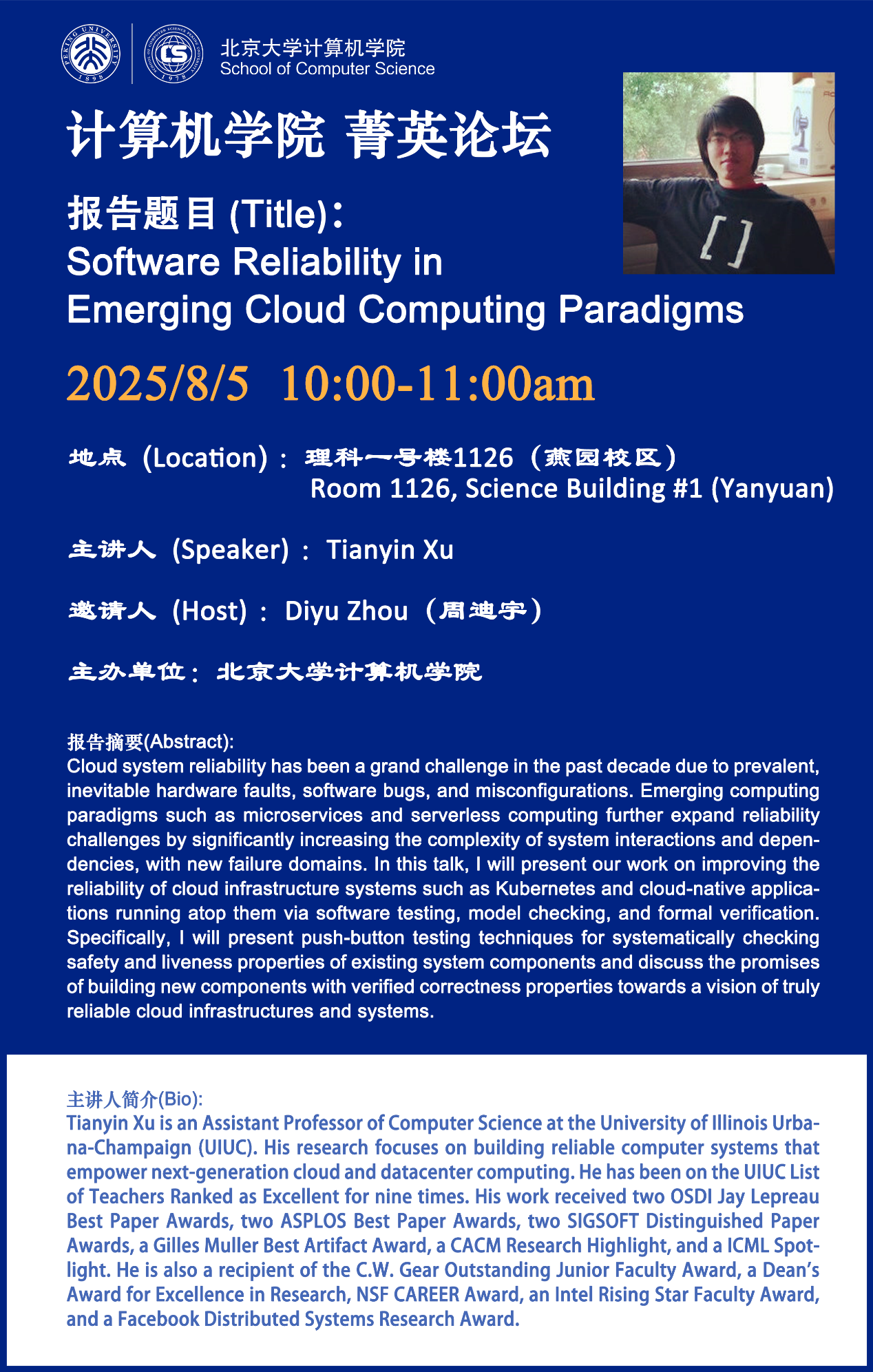 Tianyin Xu is an Assistant Professor of Computer Science at the University of Illinois Urbana-Champaign (UIUC). His research focuses on building reliable computer systems that empower next-generation cloud and datacenter computing. He has been on the UIUC List of Teachers Ranked as Excellent for nine times. His work received two OSDI Jay Lepreau Best Paper Awards, two ASPLOS Best Paper Awards, two SIGSOFT Distinguished Paper Awards, a Gilles Muller Best Artifact Award, a CACM Research Highlight, and a ICML Spotlight. He is also a recipient of the C.W. Gear Outstanding Junior Faculty Award, a Dean's Award for Excellence in Research, NSF CAREER Award, an Intel Rising Star Faculty Award, and a Facebook Distributed Systems Research Award.