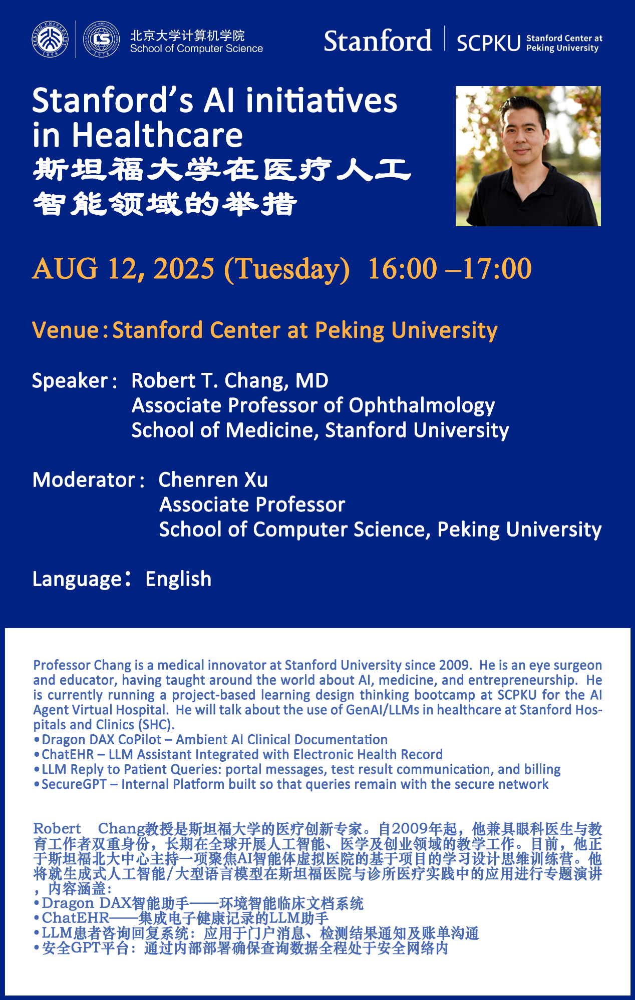 Robert Chang教授是斯坦福大学的医疗创新专家。自2009年起,他兼具眼科医生与教育工作者双重身份,长期在全球开展人工智能、医学及创业领域的教学工作。目前,他正于斯坦福北大中心主持一项聚焦AI智能体虚拟医院的基于项目的学习设计思维训练营。他将就生成式人工智能/大型语言模型在斯坦福医院与诊所医疗实践中的应用进行专题演讲,内容涵盖: