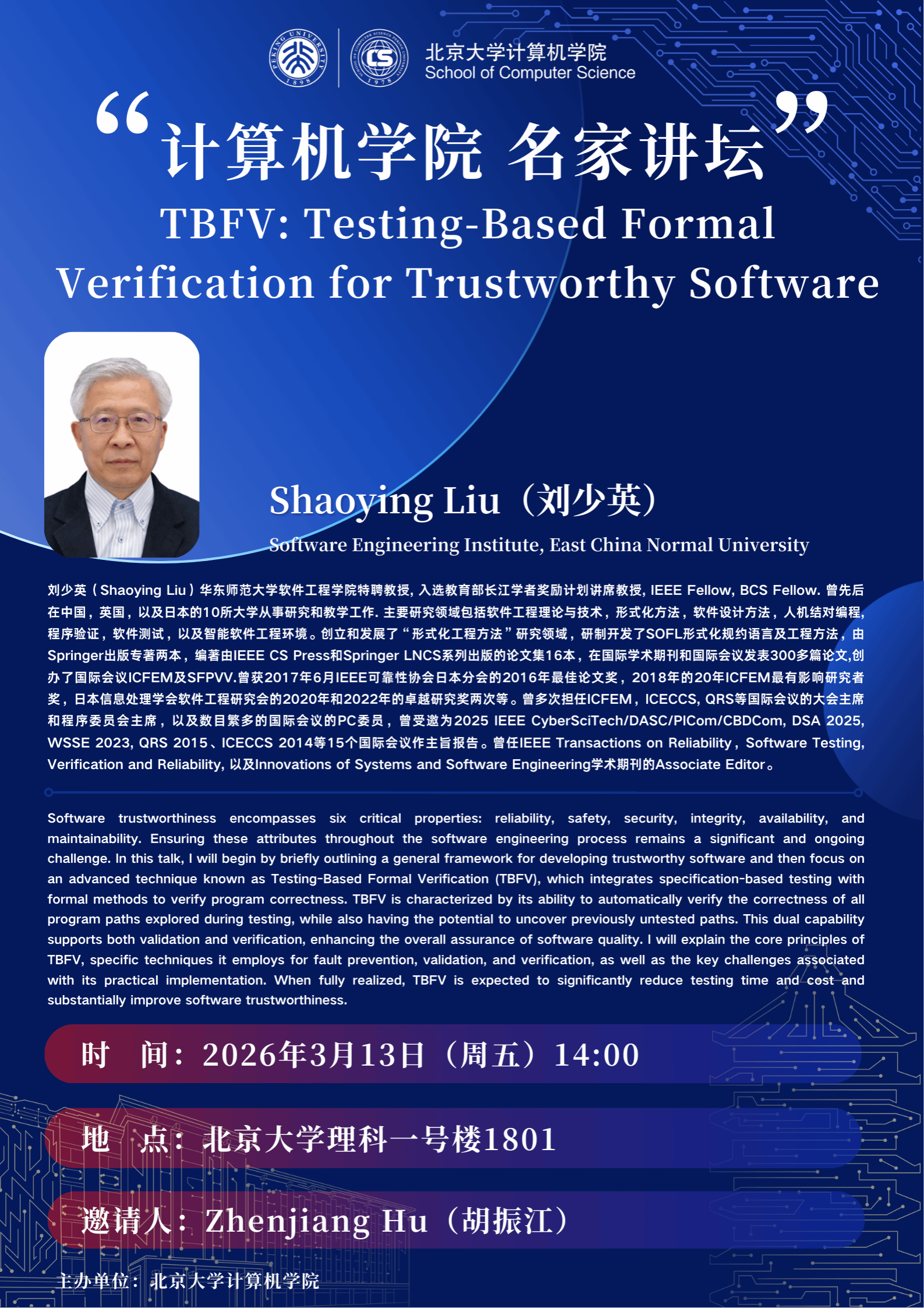 计算机学院系列讲座名家讲坛第32期——TBFV: Testing-Based Formal Verification for Trustworthy Software