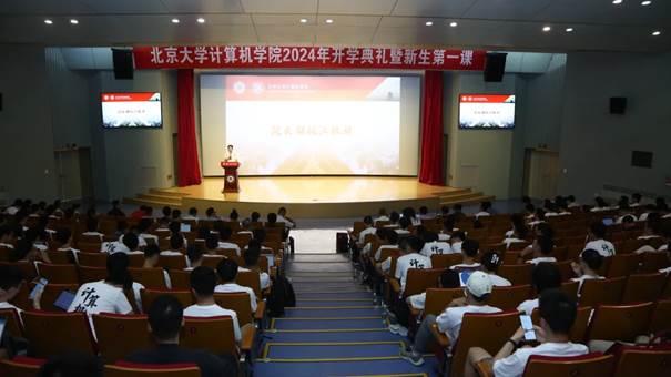 93日下午,北京大学计算机学院2024年开学典礼暨新生第一课在新燕园国际报告厅举行。计算机学院院长胡振江,院党委书记熊校良,保卫部副部长廖安,院党委副书记马思伟,副院长崔斌、郭耀、周明辉出席典礼。参加典礼的还有教师代表陈钟、陈斌、张路、赵海燕、余华山、王韬、刘先华、边凯归、施柏鑫、王若松、赵通、陈翔、李源、赖清楠、张化瑞,学院2024级全体新生,以及综合办公室、教务办公室、学生工作办公室的老师们。典礼由院党委副书记魏朋主持。
