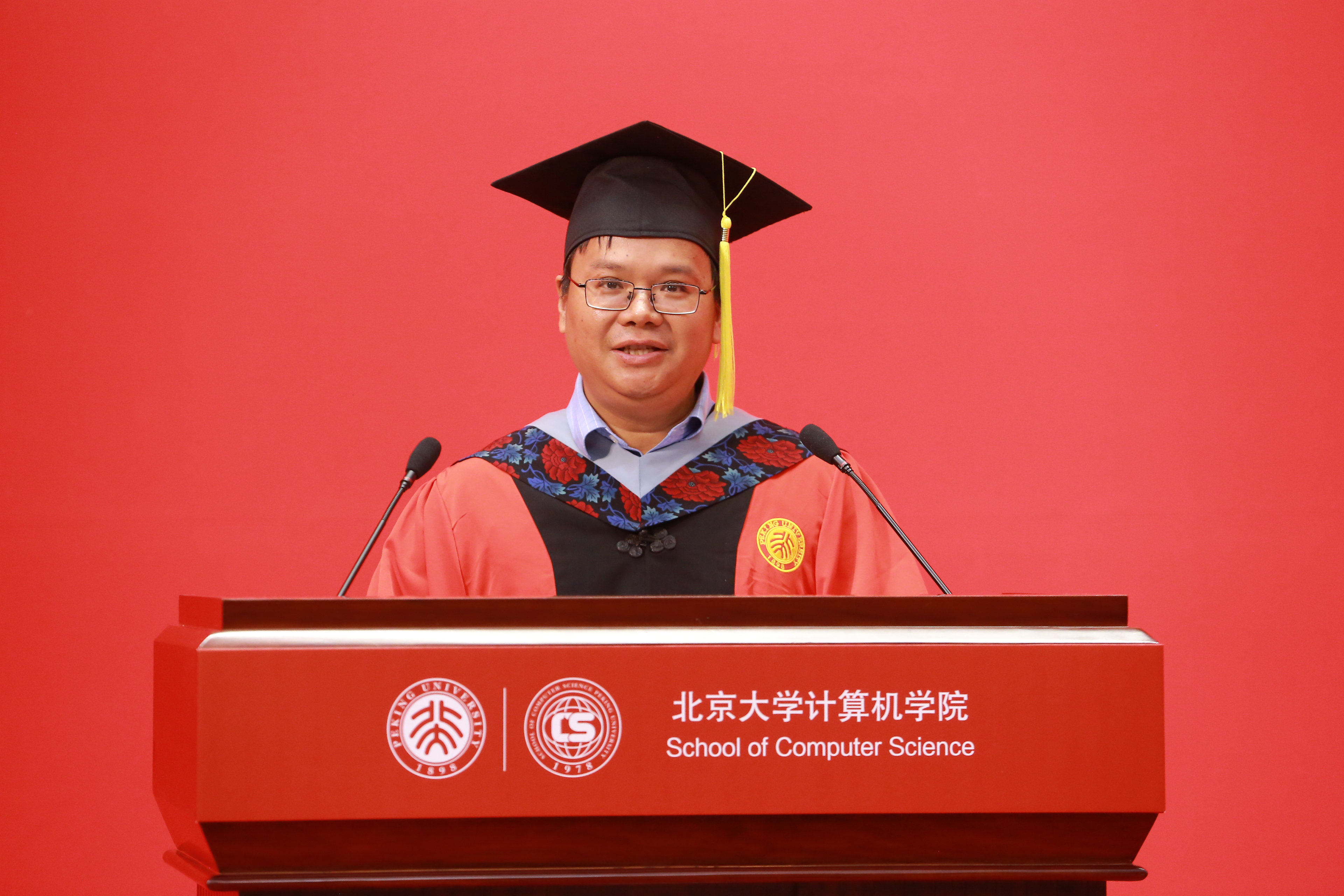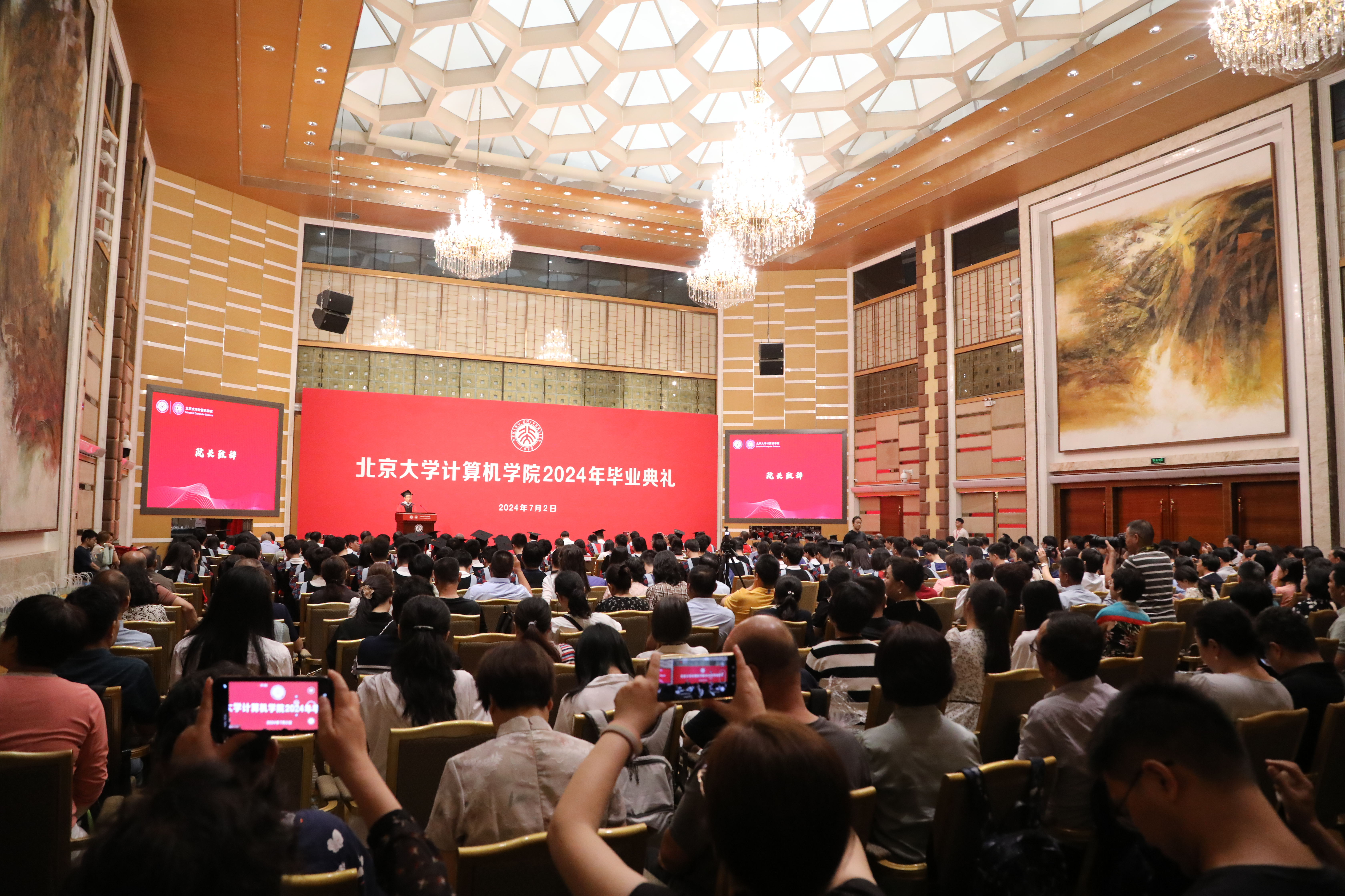 7月2日上午,北京大学计算机学院2024年毕业典礼暨学位授予仪式在英杰交流中心阳光厅举行。计算机学院院长胡振江,院党委书记熊校良,联培导师刁兴春,新校区管理委员会办公室主任李航、副主任张剑岷、王文彦、刘金秋、韦宇,保卫部副部长廖安,副院长崔斌、郭耀、周明辉,院党委副书记马思伟,北京大学人工智能创新中心名誉主任、百度七剑客、酷我创始人、智慧基石资本创始人、计算机学院校友会副会长、优秀校友代表雷鸣出席典礼。