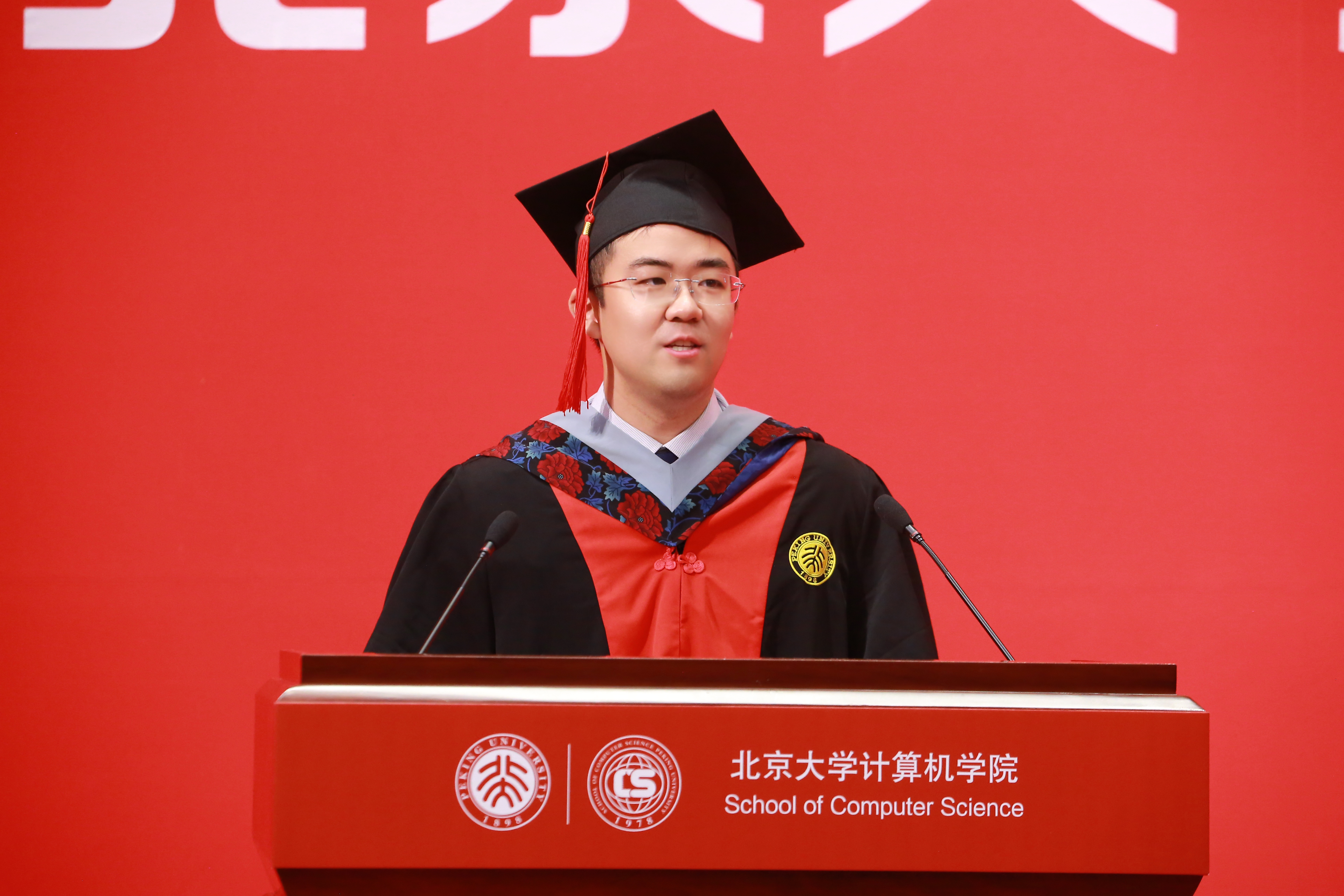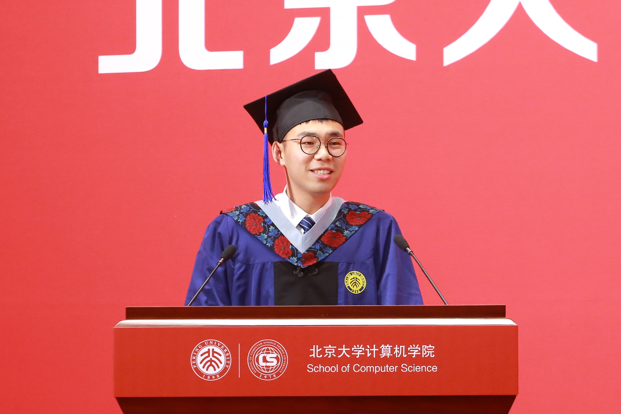 硕士毕业生李展昆回顾了他在计算机学院的科研与学工经历。他表示,北大计算机给自己上了勇气、能力、理想三节课。在科研中,他学会了有勇气永不放弃,在多样的学生工作中,他锻炼了能力、找到了人生的意义。他希望大家今后在面对人生的大风大浪、面对祖国和人民的重要考验时,依然以新青年之标准要求自己,以新青年之理想指引自己依然能保持最阳光的青春气息,保有那份每一个北大计算机人内心的新青年之勇气。