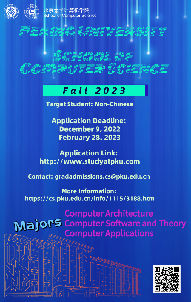 To help you have a better understanding of our School, we also encourage you to watch our recruitment videos, PKU Computer Science Postgraduate Recruitment | Asian Universities Alliance (eeo.cn). For detailed information about the application process, please visit our website: Application Guide for Ph.D. Program in Computer Science at Peking University (International Students, Fall 2023)-北京大学计算机学院 (pku.edu.cn)