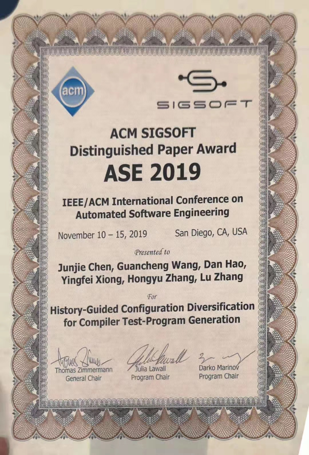 A team from Software Engineering Institute Peking University won ACM SIGSOFT Distinguished Paper Award for Automatic Software Engineering 2019