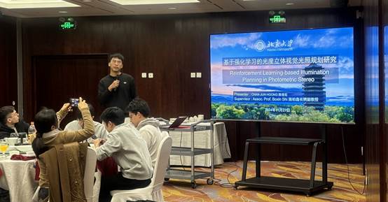 Jun Hoong Chan, a Malaysian Ph.D. student (advisor: Professor Shi Boxin), shared his progress on "Reinforcement Learning-Based Illumination Planning for Photometric Stereo." He offered an in-depth analysis of the research challenges, solutions, and potential applications, earning rounds of applause from the audience.