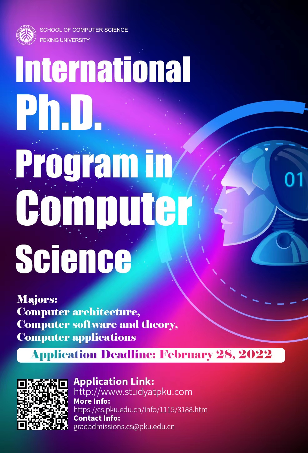 The School of Computer Science at Peking University, Beijing, China, seeks top international students to join the Ph.D. program and conduct innovative and impactful research in a world-class research environment, and to cultivate world-class talents in computer science. All students admitted to the Ph.D. program will receive full financial support, including tuition and monthly stipend.