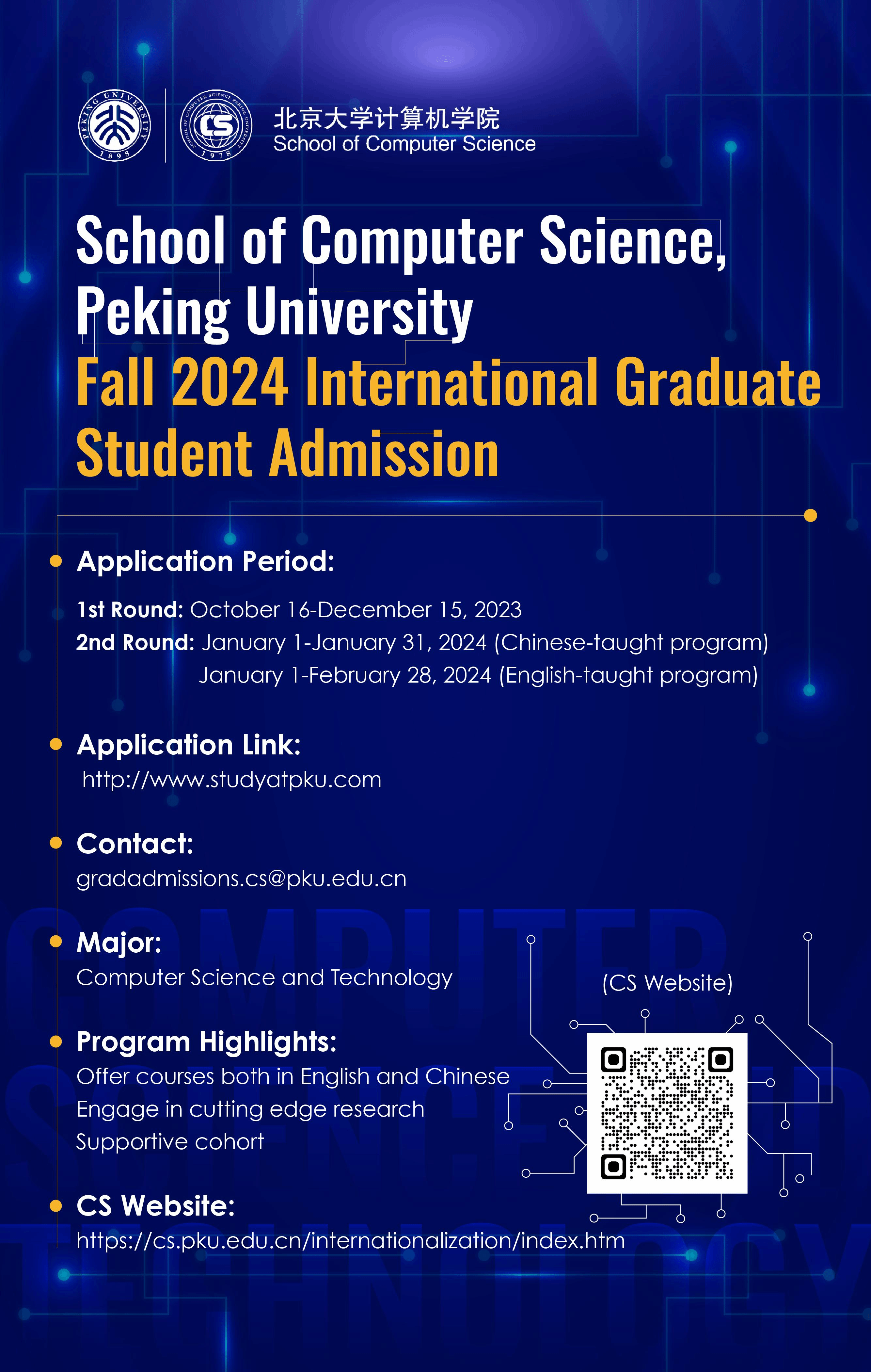 The School of Computer Science at Peking University, Beijing, China, seeks for top international students to join the graduate programs and conduct innovative and impactful research in a world-class research environment, and to cultivate world-class talents in computer science.