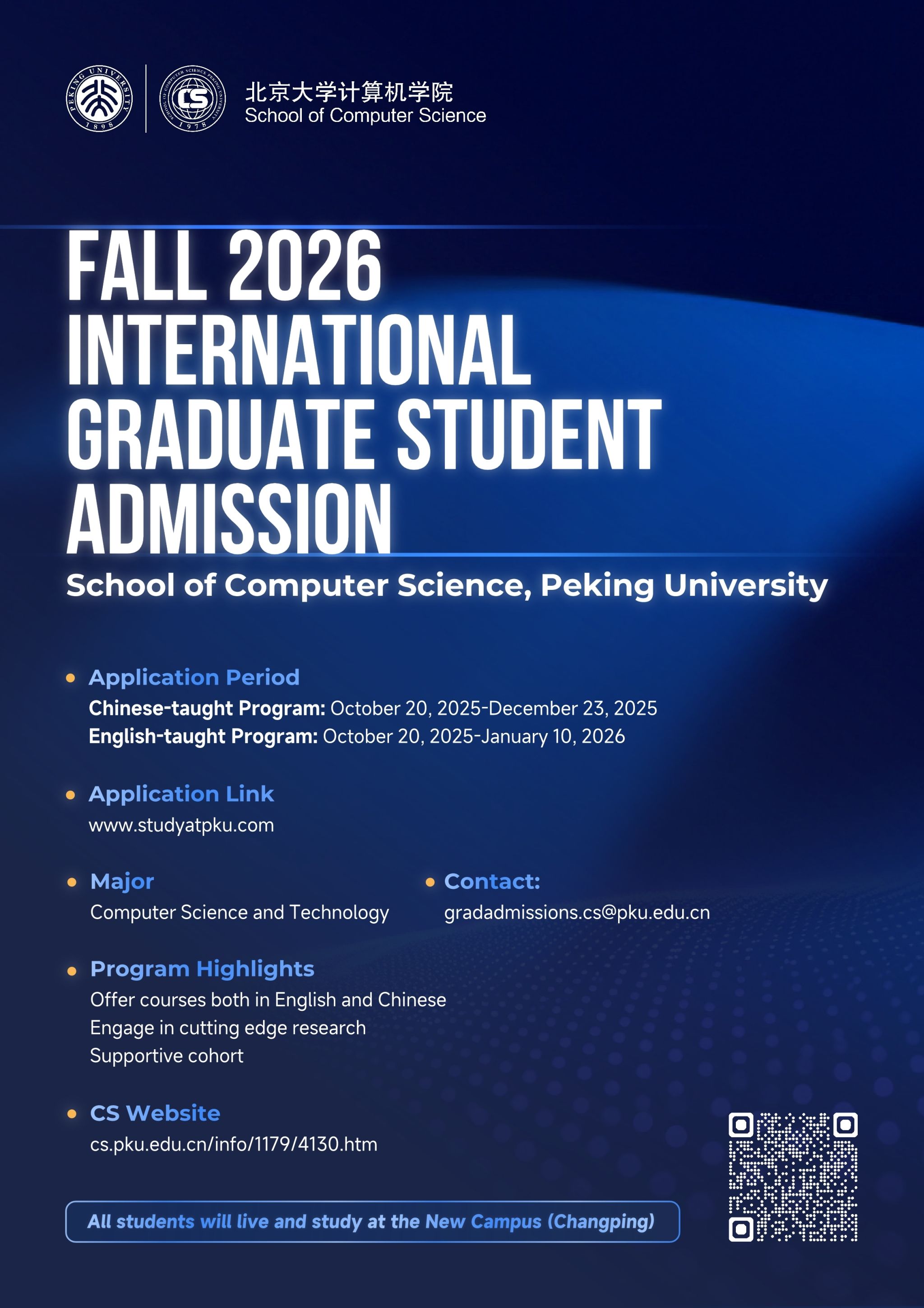 English-taught Program: Room 510, School of Computer Science, Peking University, 151 Zhongguancun North Street, Haidian District. Please note on the envelope: Graduate student application materials