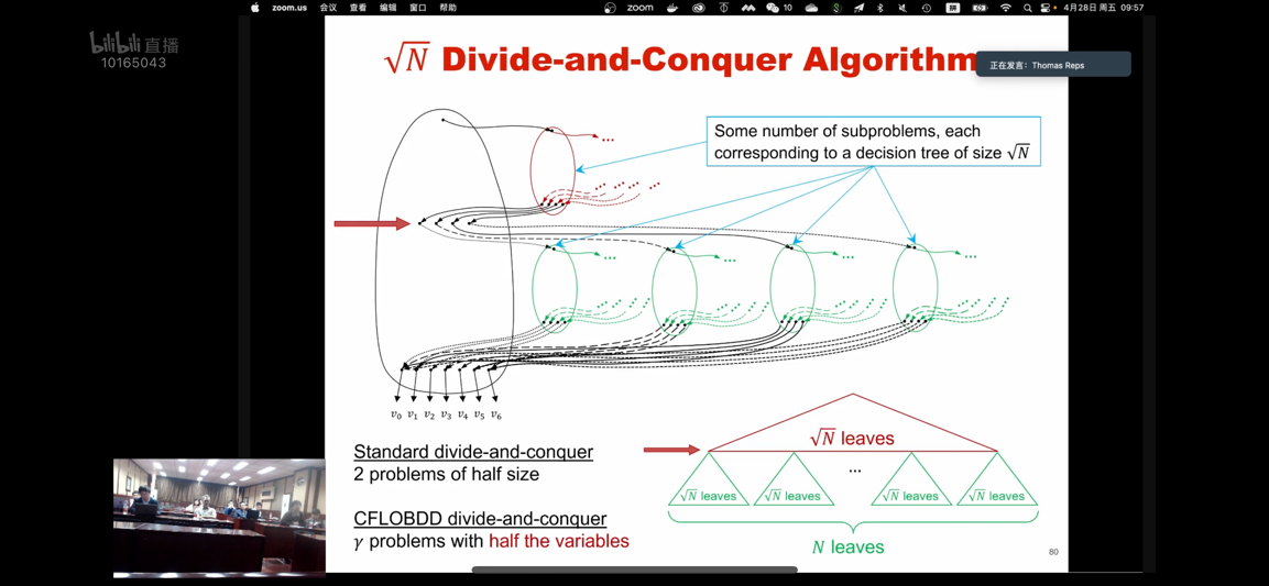 本次学术报告介绍了“CFLOBDD”,一种全新的适用于模型检查、路径分析、量子模拟等多领域的数据结构。Reps教授详细地介绍了这一数据结构的研究起源、设计思路、性能证明与应用效果。