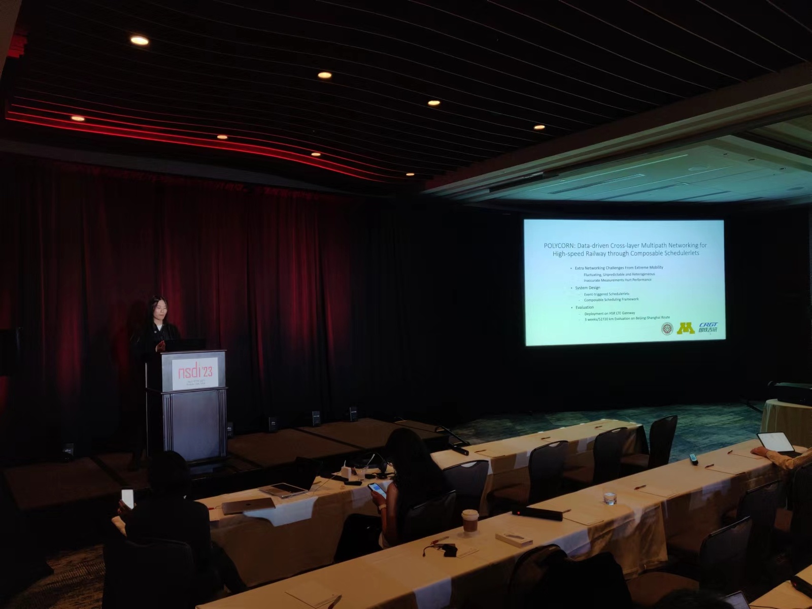 该工作以《POLYCORN: Data-driven Cross-layer Multipath Networking for High-speed Railway through Composable Schedulerlets》为题,发表于今年的NSDI中的Alternative Networks会场,由文章第一作者北京大学计算机学院18级博士生倪蕴哲进行宣讲,合作作者包括钱风副教授(明尼苏达大学双城分校)、刘泰德、程翊华、马知遥、王婧、王忠锋(国铁吉讯)、 黄罡教授、刘譞哲副教授、许辰人副教授(通讯作者)。