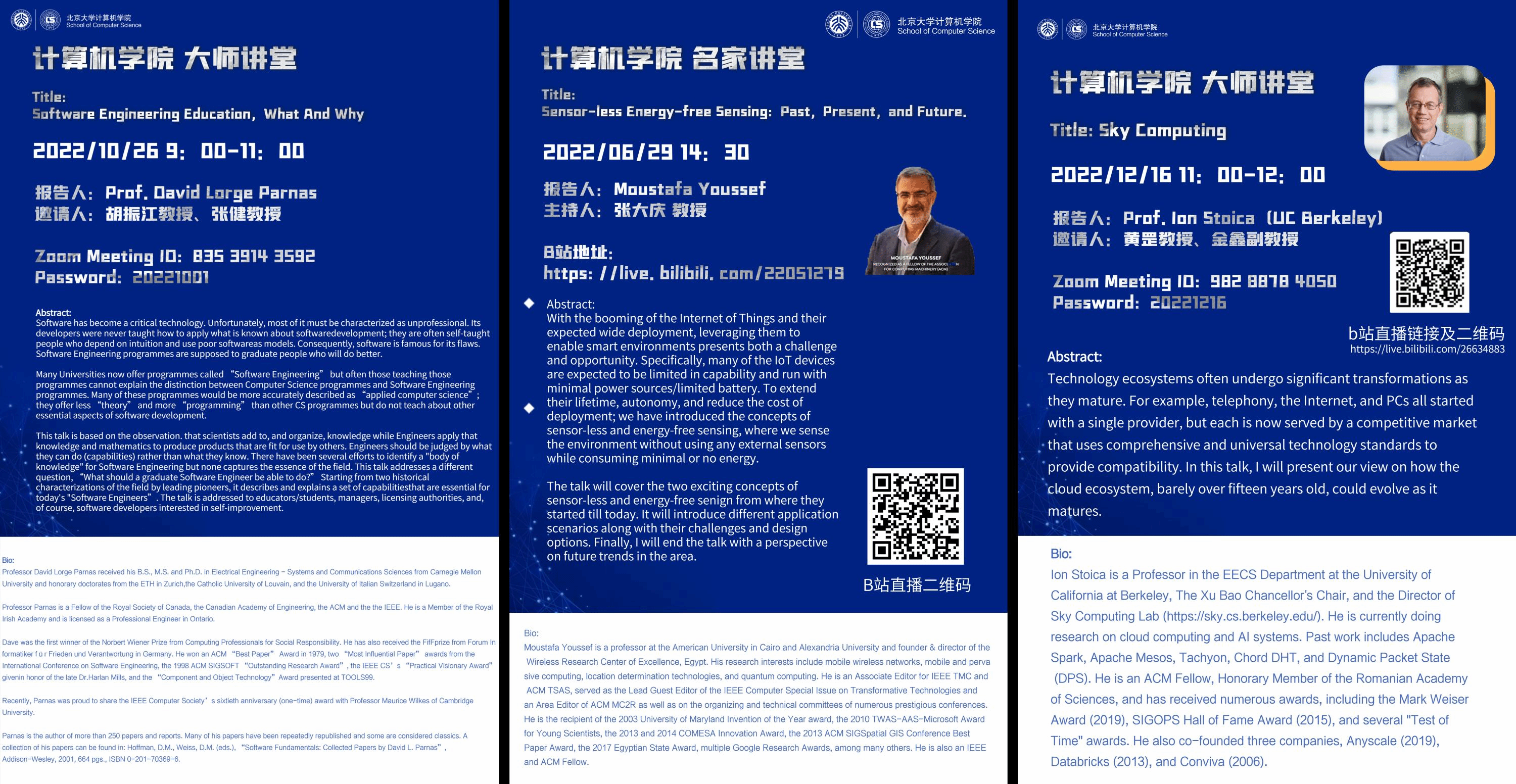 为推进北京大学计算机学院的国内外学术交流、扩大学术影响,特别是促进青年教师的学术成长,组织计算机学院系列讲座,邀请对象为世界级学术大师。