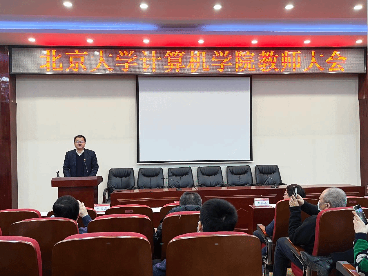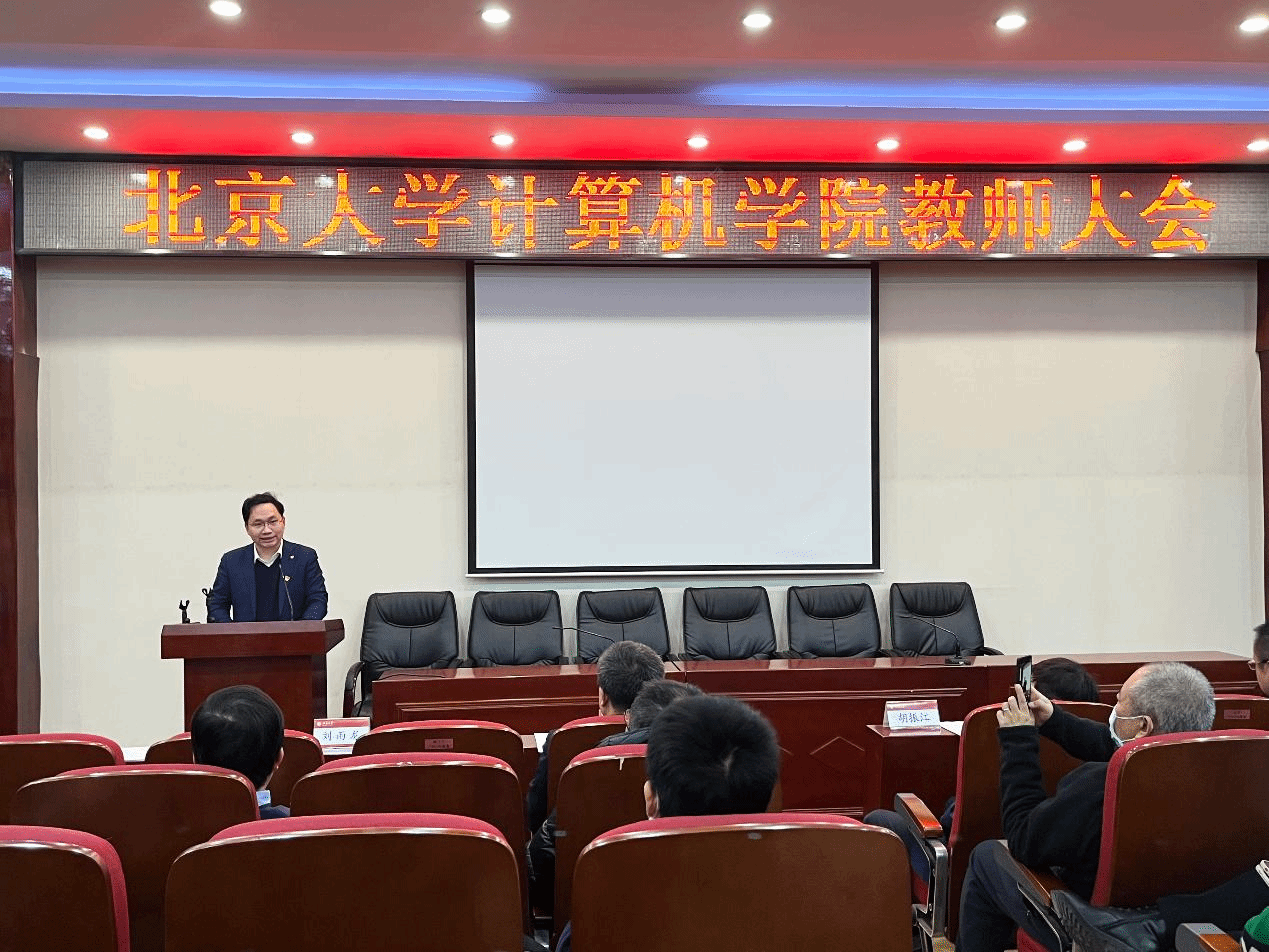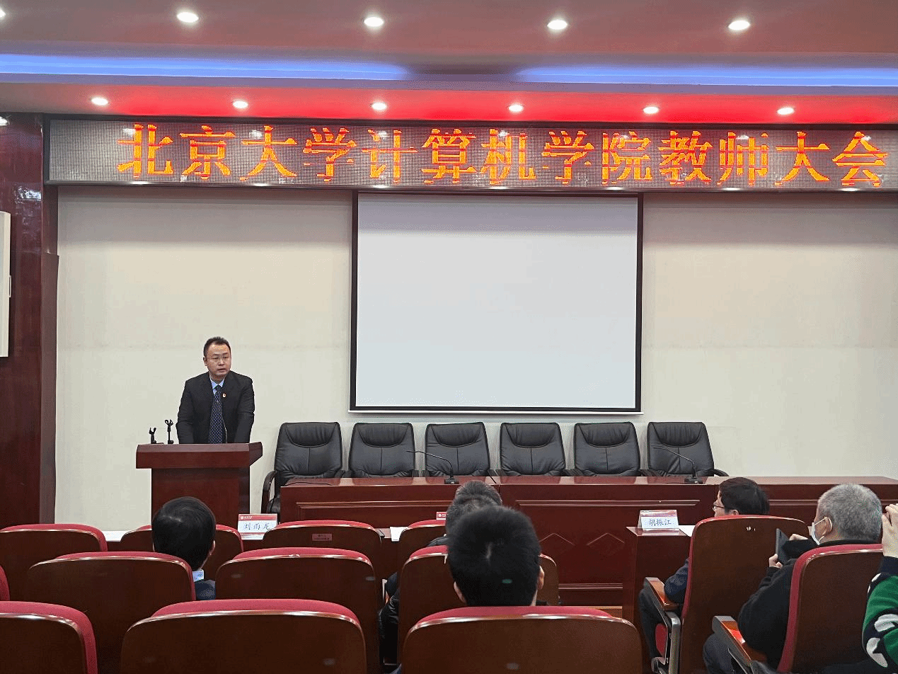 2022年1月10日,北京大学计算机学院在理科2号楼召开教师大会,北京大学党委常委、副校长张平文院士,党委组织部副部长刘雨龙以及计算机学院部分教职工参加大会。刘雨龙宣读了《关于成立中共北京大学计算机学院委员会的通知》,宣布了胡振江、熊校良和魏朋同志的任职决定,并对相关选拔任命工作进行了说明。计算机学院院长胡振江、党委书记熊校良、副书记魏朋依次进行任职发言,张平文副校长最后做了总结讲话。
