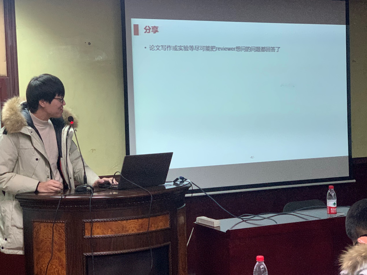 2019级博士生孙泽宇同学继续分享。他认为同学们需要“常怀好奇心,对有趣的事物感兴趣”。通过一个机器翻译的小故事,鼓励同学们可以学着“从生活中发现可以研究的东西”。接着,他举了自己一篇论文的例子,告诉我们:当我们觉得做不下去的时候,千万不要放弃,告诉自己“工作一定可以做下去的”,并且耐心的反复打磨自己的论文。好的工作需要反复的打磨和历练。面对被拒稿要有好的心态,告诉自己“只是还没有中而已”。最后,他对论文的写作给出了一些建议。他建议“论文要尽可能solid”,在写作或实验等地方就尽可能把审稿人想问的问题都回答了。