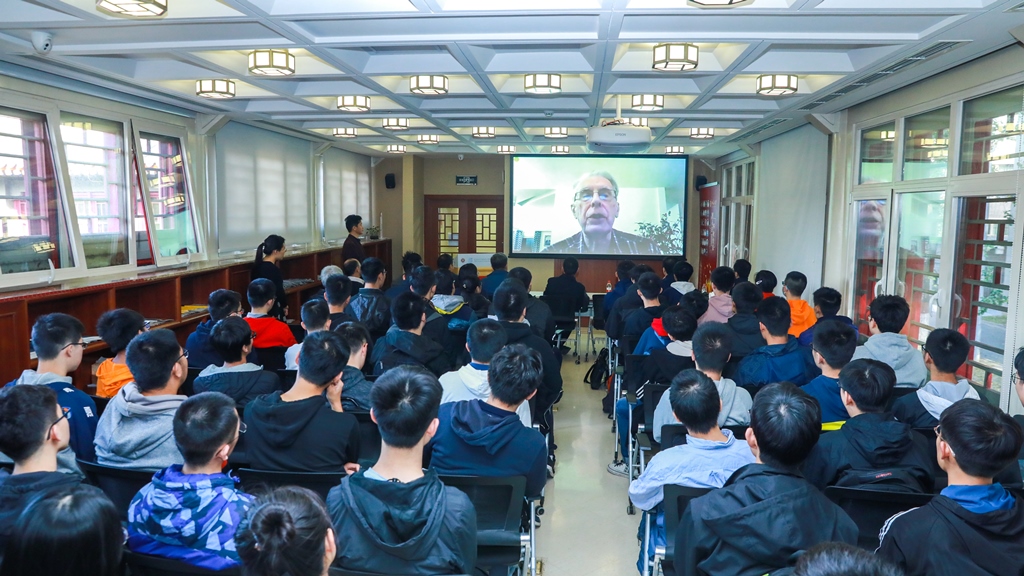 北京大学访问讲席教授、前沿计算研究中心主任、图灵班指导委员会主任约翰·霍普克罗夫特(John Hopcroft)受疫情影响无法来到现场,通过视频祝贺同学们入选图灵班。霍普克罗夫特教授用自己的经历鼓励同学们:身处各领域正在发生巨大变革的时代,同学们应抓住机遇,胸怀更远大的志向和目标,敢于探索新的领域。他表示,大学生活将对人的一生产生重要影响,希望大家珍惜和老师、同学们相处的时光,并期待在不久的将来和同学们面对面交流。