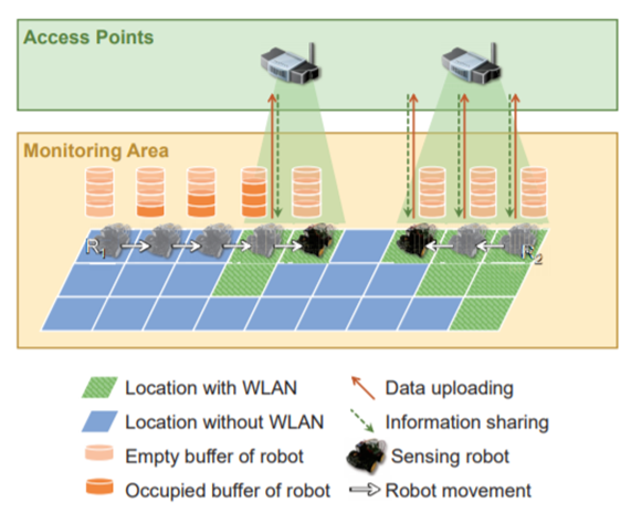 对于传输层的测量覆盖范围问题,在室内,团队利用多个无人小车作为移动节点(Z. Hu et al., IEEE WCNC, 2020; Z. Hu et al., IEEE IOTJ, 2020),在没有信号覆盖的位置缓存空气质量数据,在有信号的位置上传数据并下载其他小车的分享数据,利用不完全信息为每个小车设计行动策略,使无人小车具有智能决策、自主移动、实时测量的功能。在室外,团队利用具有高移动性无人机进行三维环境的空气监测(Y. Yang et al., IEEE IOTJ, 2018; Y. Yang et al., IEEE GLOBECOM, 2017),设计对应无人机飞行路径规划的优化算法,最终解决传输层的覆盖范围问题,实现对细粒度数据的高效、实时监测。