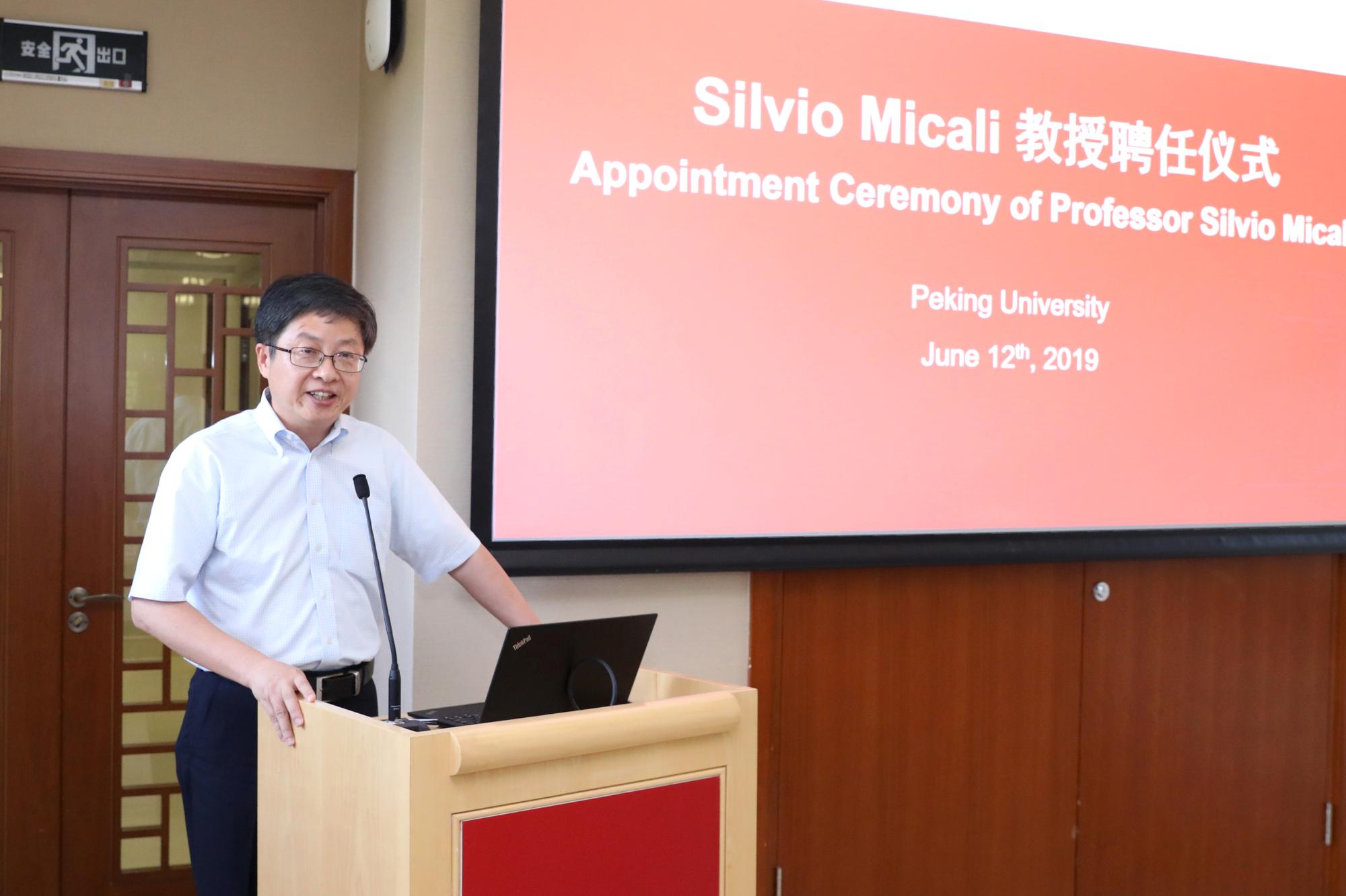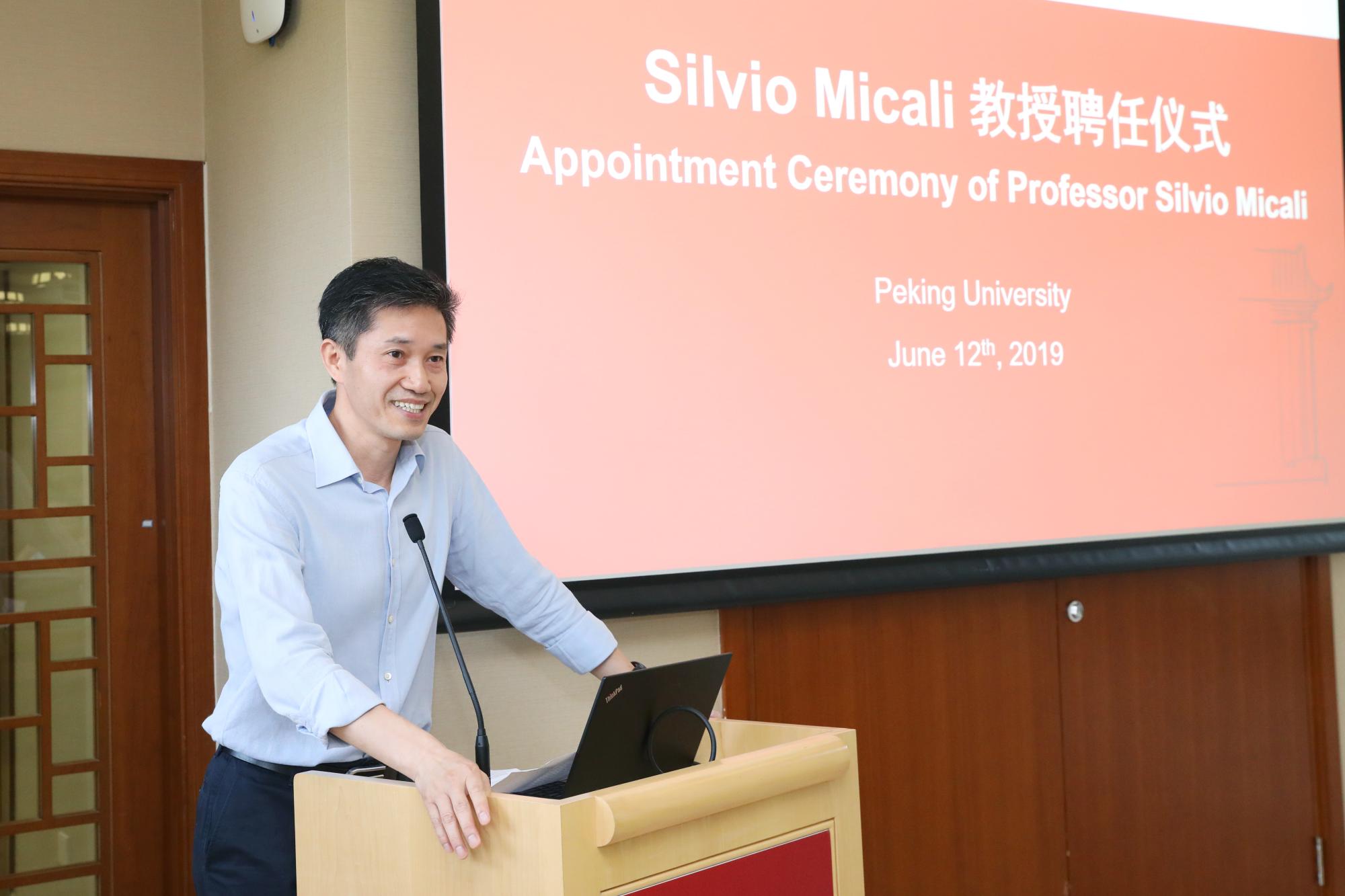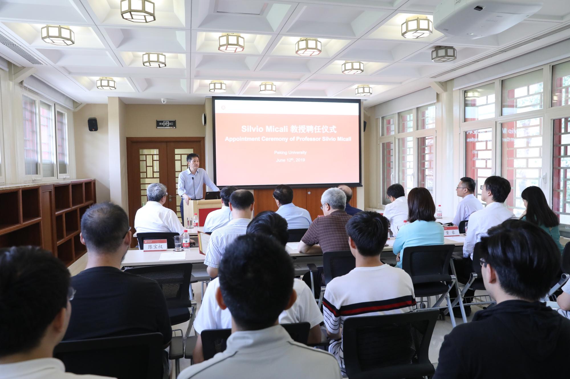 2019年6月12日,麻省理工学院Ford讲席教授、2012年图灵奖(A.M. Turing Award)获得者希尔维奥·米卡利(Silvio Micali)教授北京大学聘任仪式暨学术讲座在静园五院204会议室举行。北京大学校长郝平,研究生院常务副院长、工学院院长张东晓,国际合作部部长夏红卫,信息科学技术学院常务副院长谢冰,信息科学技术学院副院长、计算机科学技术系主任胡振江,前沿计算研究中心执行主任陈宝权,前沿计算研究中心副主任王亦洲等莅临现场。来自信息学院、数学科学学院等单位的近百名师生参加学术讲座并见证了聘任仪式。活动由陈宝权教授主持。