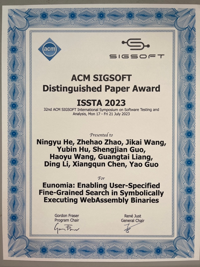 北京大学计算机学院操作系统实验室郭耀教授团队近年来在泛在软件安全分析领域,围绕静态符号执行等方向开展了一系列深入研究。最新成果以题为 “Eunomia: Enabling User-Specified Fine-Grained Search in Symbolically Executing WebAssembly Binaries” 的论文发表在2023 年国际软件测试与分析会议(2023 ACM International Symposium on Software Testing and Analysis, ACM ISSTA 2023)上,并荣获该会议的 ACM SIGSOFT 杰出论文奖(Distinguished Paper Award)。