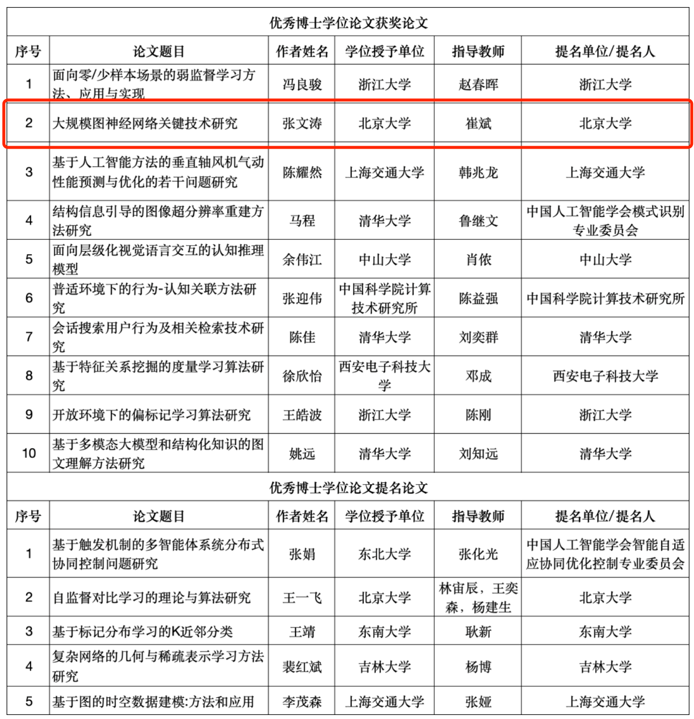“吴文俊人工智能科学技术奖”由中国人工智能学会2011年发起主办,得到中国智能科学研究的开拓者和领军人、首届国家最高科学技术奖获得者、中国科学院院士、中国人工智能学会名誉理事长吴文俊的支持,是中国历史上第一次以“人工智能”命名的奖项,被外界誉为“中国智能科学技术最高奖”。据悉,2023年中国人工智能学会共最终选出10篇优秀博士学位论文和5篇提名论文。
