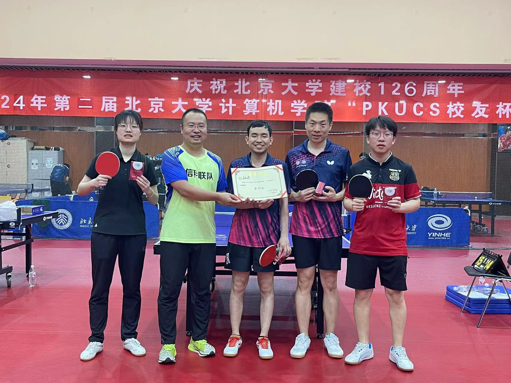 校友队:我们的队伍是由五名散报选手组成。虽然来自于不同的课题组,但是我们很快在球场上找到了“默契”,并且为了凝聚团队力量、为比赛助威,杨涛队长为队伍准备了统一的队服,我们迅速形成了一支“有组织”的球队。比赛中,杨涛队长更是发挥了“稳定军心”的作用,在男单比赛中发挥极其稳定,攻球、搓球等攻防转换的节奏“拿捏”相当到位;雷老师与来自北大乒协的选手对战中也表现相当英勇,将比分咬得很紧,发挥非常出色。这次比赛不仅让来自各个岗位的校友能够享受到比赛的快乐,更重要的是加深了我们与学校的联系,其实大家一直都很想念母校,想念曾经共同成长过、奋斗过的计算机学院,希望计算机学院越来越好,也祝愿明年我们能够再创辉煌!