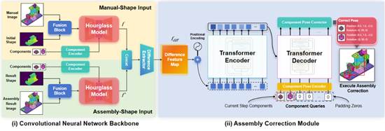 为了让机器人具备自我纠错的能力,团队在设计网络时提出了一个创新的思路:将已组装的组件视为查询对象,结合组装手册与组装结果的差异,帮助机器人识别并纠正错误。基于这一思路构建的自纠错网络,机器人能够在组装过程中识别并纠正错误组件,从而显著提升组装的准确性。