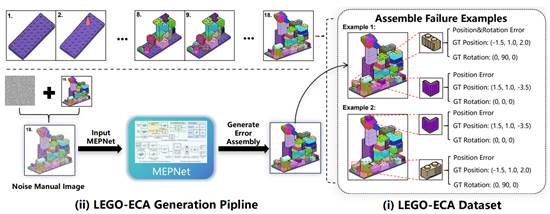LEGO-ECA数据集是首个包含失败样例的组件组装数据集,来源于基于MEPNet合成的LEGO数据集。在构建过程中,研究团队从1429个组装手册中随机挑选,将其输入组装网络MEPNet,并通过加入高斯噪声干扰组装过程,成功生成了丰富的错误组装样本。最终,LEGO-ECA数据集包含约12万种不同的错误样例,成为机器人组装任务中不可或缺的重要资源。