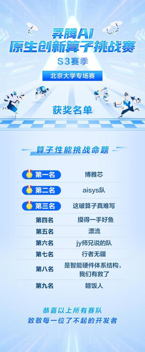 值得一提的是,来自计算机学院的“博雅芯”队和“aisys队”还分别以13.180264us和15.280306us的算子性能数据,成为本赛季在ArgMaxWithValue这一赛题上最先超越19us优质性能标准的两个赛队,截至发稿时间仍霸榜第一、第二名。在北大专场赛结束时,根据本赛季该赛题的实时榜单排名显示,前10名中有5名是来自北大的参赛队伍,充分展示了北大学子的卓越实力和创新能力。