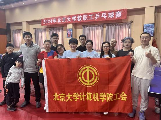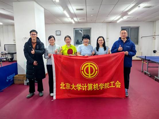 计算机学院女子1队由李文新老师领队,另含张铭、刘小青、刘古月三位老师,四位运动员都是博士,其中李文新和张铭老师是二级教授,体现了北大职工的高学历特色。面对来自全校各学院和部门的对手们的挑战,四位老师展现了非凡的勇气和团队精神,在激烈的北大教职工乒乓球赛中荣获团体并列季军的成绩。