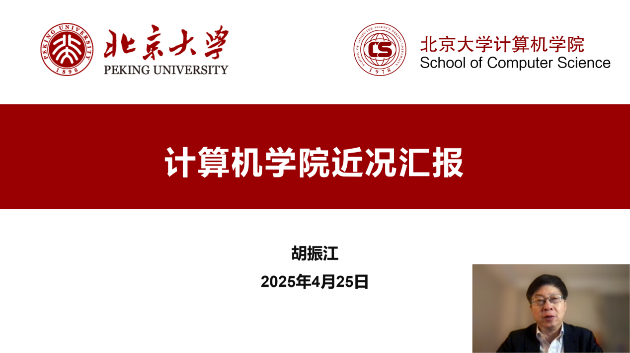 胡振江汇报了学院近期发展情况。为建设国际一流的计算机学科,吸引国际一流人才,胡振江院长分别从党建、教学、科研、国际化、教师和学生工作等方面介绍了学院一年来取得的成绩和最新进展。他表示,今年是北大的“科技创新年”,期待广大校友继续发挥桥梁纽带作用,在人才培养、科研合作、成果转化等方面深化与母校的联动,共同推动世界一流的计算机学科建设。