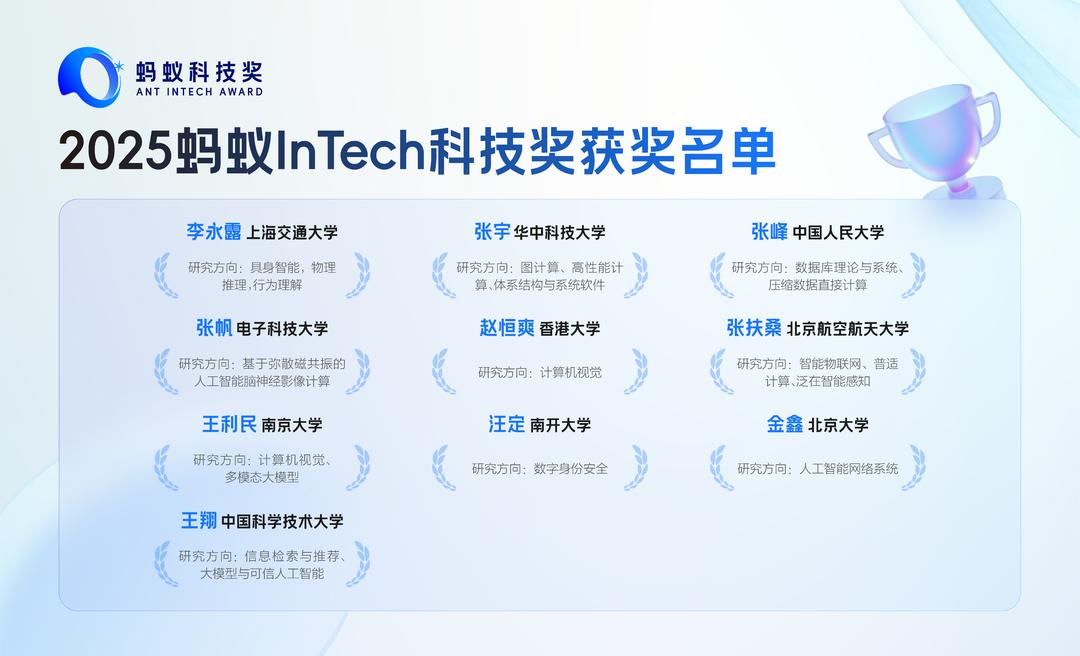 2025蚂蚁Intech奖是由蚂蚁科技集团股份有限公司设立的奖项,面向计算机科学领域的优秀青年学者与在读博士生提供公益性科研资金支持,设立“蚂蚁Intech科技奖”和“蚂蚁Intech奖学金”两大核心奖项。