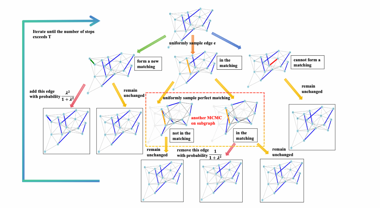 针对这一问题,李彤阳课题组聚焦无权图这一具有重要理论意义的场景,提出了双循环 Glauber 动力学(Double-loop Glauber Dynamics)算法。该算法在传统马尔可夫链采样的外层迭代中,引入内层链在导出子图上近似均匀地采样完美匹配,从而将采样分布的权重从与 hafnian 成正比提升至与 hafnian 的平方成正比,实现了与高斯玻色采样分布的精确对齐。