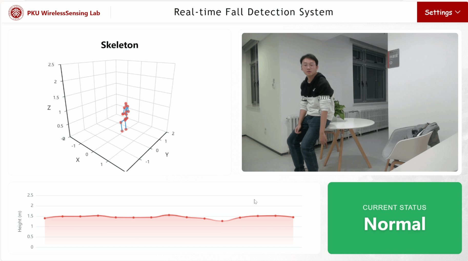 北京大学计算机学院讲席教授、欧洲科学院院士、IEEE Fellow张大庆指导的无线感知团队长期致力于无线感知基础理论与前沿技术研究,利用Wi-Fi/mmWave/5G/6G等泛在无线信号,在无需佩戴设备的情况下对室内人员进行定位追踪、生命体征监测、跌倒检测、行为识别及日常状态感知。团队首创基于菲涅尔区的无线感知理论,系统揭示了信号变化与目标运动、设备位置间的内在关系,并提出CSI商模型、感知信噪比模型、CSI差分模型等理论框架,在呼吸监测、入侵检测、连续行为识别等一系列应用中取得国际领先成果。