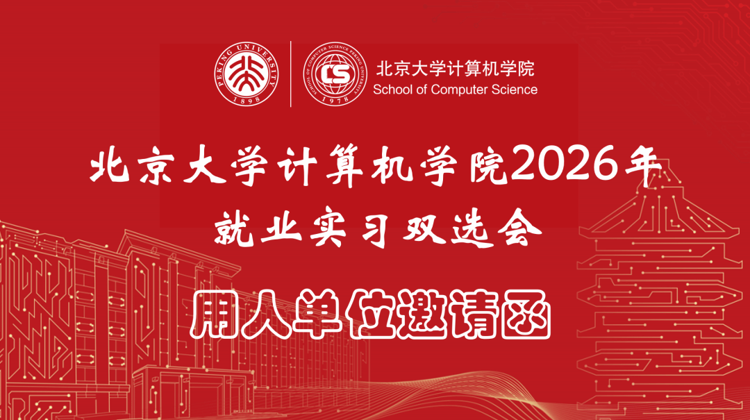 为深入学习贯彻党的二十大和二十届四中全会精神,全面落实党中央关于促进毕业生高质量充分就业工作的决策部署,切实响应国家对关键领域拔尖人才培养和就业指导的战略要求,北京大学计算机学院始终致力于为各行业输送高素质、高水平的创新型人才,并以实际行动助力用人单位与毕业生实现精准对接。值此2026届毕业生启航之际,北京大学计算机学院将举办北京大学计算机学院2026年就业实习双选会,诚挚邀请对口单位和优秀校友企业拨冗参加,共襄高校育人与社会发展携手并进的盛举。衷心感谢各用人单位、各位校友长期以来对我院就业工作的大力支持!