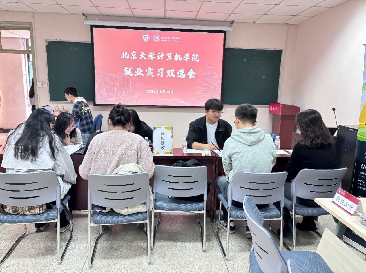 为深入贯彻落实国家关于促进高校毕业生高质量充分就业的决策部署,进一步深化产教融合、校企协同育人机制,3月30日下午,北京大学计算机学院在理科一号楼举办2026年春季就业实习双选会暨“计启新程”技术前沿分享会。计算机学院院长胡振江、党委书记熊校良、党委副书记魏朋、团委书记于丹等出席活动并现场指导。