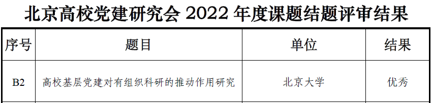 北京高校党建研究会近日发布了《关于公布北京高校党建研究会2022年度课题评审结果的通知》。我院党委立项的高校党建研究重点课题——《高校基层党建对有组织科研的推动作用研究》,顺利通过评审,并被评为“优秀”课题。此次参加评审的课题共28项,评为优秀的有7项。