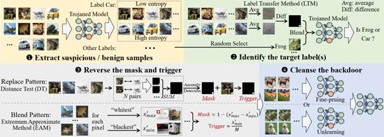 图:ReBack工作流程:提取可疑样本、识别后门标签、反转掩码和触发器、清除后门