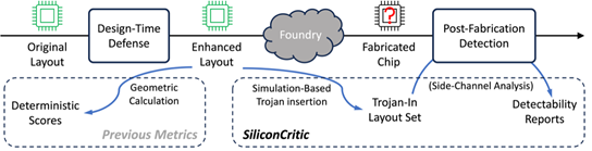 为了缩小实际制造时木马注入和制造前版图风险评估的差异,论文《Rethinking IC Layout Vulnerability: Simulation-Based Hardware Trojan Threat Assessment with High Fidelity》提出了基于木马注入仿真的可扩展评估框架SiliconCritic。该框架巧妙利用芯片设计时的技术来模拟黑盒的芯片制造时木马注入,以及后续的侧信道分析。通过比对注入木马前后某些侧信道指标(时序/功耗相关)的变化,设计者能够得到该版图被此种木马注入的难度,因为指标变化越大意味着越容易定位出木马。实验对现实世界中的木马攻击和防御进行评估,有效分析了现有设计时防御技术的局限性,并发现结合木马特性进行针对性优化能起到更好的防御效果。总的来看,本工作创建了版图木马风险评估的新范式,为未来的木马防御提供了新的视角。