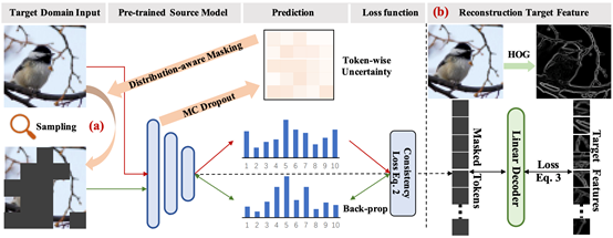 CVPR 2024论文《Continual-MAE: Adaptive Distribution Masked Autoencoders for Continual Test-Time Adaptation》提出了一种面向持续性泛化学习的分布感知掩码自编码器。具体来说,持续性测试泛化(CTTA)旨在将预训练模型迁移到不断变化的目标分布中,以应对真实世界的动态变化。现有的CTTA方法主要依赖于熵最小化或教师-学生伪标签方案,在未标记的目标域中进行知识提取。然而,动态数据分布会导致预测结果校准错误和伪标签噪声,这在现有的自监督学习方法中阻碍了有效缓解错误积累和灾难性遗忘问题。为了解决这些挑战,本文提出了一种全新的持续性自监督方法,即自适应分布掩码自动编码器(ADMA),该方法在增强目标域知识提取的同时,减轻了分布偏移的错误积累。具体来说,提出了一种分布感知掩码(DaM)机制,以自适应地选择掩码位置,然后在掩码目标样本和原始目标样本之间建立一致性约束。此外,对于掩码的特征,利用高效的解码器来重建手工制作的特征描述符(例如方向梯度直方图),利用其域不变性来增强任务相关的表达。通过在四个广泛认可的基准上进行大量实验,所提出的方法在分类和分割CTTA任务中均达到了最先进的性能。