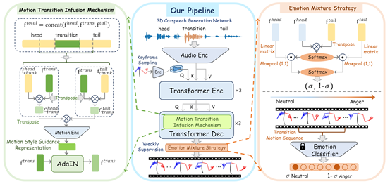生成生动且富有情感的3D协同语音手势对于人机交互应用中的虚拟头像动画至关重要。虽然现有的方法能够生成遵循单个情感标签的手势,但它们忽略了具有情感转换的长手势序列建模在真实场景中更实用。此外,缺乏具有情感转变语音和相应3D人类手势的大规模可用数据集也限制了该任务的解决。为了实现这一目标,CVPR 2024论文《Weakly-Supervised Emotion Transition Learning for Diverse 3D Co-speech Gesture Generation》首先结合 ChatGPT-4和音频修复方法来构建高保真情感转换人类语音。考虑到获得与动态补全的情绪转换音频相对应的真实3D姿势注释极其困难,本文提出了一种新颖的弱监督训练策略来鼓励权威手势转换。 具体来说,为了增强过渡手势相对于不同情感手势的协调,本文将两个不同情感手势序列之间的时间关联表示建模为风格指导,并将其注入到过渡生成中。本文进一步设计了一种情感混合机制,该机制基于可学习的混合情感标签为过渡手势提供弱监督。最后,本文提出了一个关键帧采样器,可以在长序列中提供有效的初始姿势提示,使得能够生成不同的手势。大量的实验表明,所提出方法优于通过在本文新定义的情绪转换任务和数据集上微调单一情绪对比方法而构建的最先进模型。