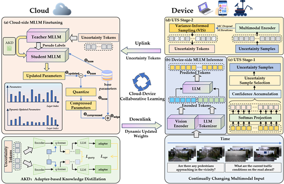 在如今的数字化时代,随着云计算和边缘设备技术的迅猛发展,如何在资源受限的设备上高效部署多模态大模型成为了一个亟待解决的难题。针对这一问题,CVPR 2024论文《Cloud-Device Collaborative Learning for Multimodal Large Language Models》提出了一种创新的云-设备协同持续适应框架(CD-CCA),该框架旨在利用云端大规模多模态大模型(MLLM)的强大能力,提升压缩后设备端模型的性能,从而应对动态变化的环境。在设备到云的上行链路中,采用了一种不确定性引导的Token采样策略(UTS),通过过滤分布外的Token来降低传输成本并提高训练效率。在云端,本文提出了一种基于适配器的知识蒸馏方法(AKD),将大规模MLLM的精炼知识转移到压缩后的设备端模型中。此外,本文还引入了一种动态权重更新压缩策略(DWC),对更新后的权重参数进行自适应选择和量化,从而提高传输效率并减少云端和设备端模型之间的表征差距。实验结果表明,所提出的框架在多个多模态基准测试上优于现有的方法,尤其是在视觉问答和图像标注任务中表现突出。此外,通过真机实验验证了该方法的可行性和实用性。该框架为设备端MLLM在动态环境中的持续适应提供了新的思路,展示了云-设备协同学习的巨大潜力。