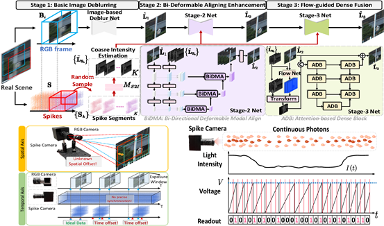 传统的基于帧的相机依赖曝光窗口成像,在高速场景中会出现运动模糊。基于帧的去模糊方法缺乏可靠的运动线索,难以在极端模糊条件下恢复清晰图像。脉冲相机是一种新型的神经形态视觉传感器,能够输出具有超高时间分辨率的脉冲流,它可以补充传统相机中丢失的时间信息,并指导运动去模糊。然而,在实际场景中,由于校准坐标的复杂性、拍摄过程产生振动而造成的设备位移和时间轴偏移,将离散的RGB图像和连续的脉冲流在时间和空间轴上对齐是一个挑战。像素的错位会导致去模糊效果严重下降。为解决此问题,CVPR 2024论文《Spike-guided Motion Deblurring with Unknown Modal Spatiotemporal Alignment》提出了一种在未知脉冲和图像时空对齐情况下的脉冲引导运动去模糊框架,并设计了包含基础模糊消除网络、双向可变形对齐模块和基于光流的多尺度融合模块的三阶段网络。实验结果表明,所提出方法可以在未知对齐情况下有效地指导图像去模糊,超越其他方法的性能。