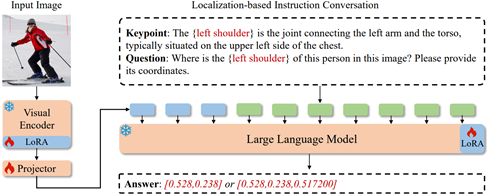 已有人体关键点定位方法从训练数据中学习人体结构先验,进而用于推理未知人体图像输入。这种学习范式的泛化能力受到训练数据的限制,即有限的数据集难以提供通用的人体结构先验,这使得现有方法难以泛化到估计未知数据集人体姿态以及检测新类型的人体结构。为了缓解这一限制并提高人体形态感知方法的泛化能力,CVPR 2024论文《LocLLM: Exploiting Generalizable Human Keypoint Localization via Large Language Model》(Highlight)从另一角度形式化人体姿态感知问题,通过推理人体骨架关键点的文本描述来定位其位置。基于这一思路,提出了首个基于多模态大语言模型的人体姿态感知方法——多模态定位大模型LocLLM。定位大模型将人体关键点定位任务形式化为一个问答任务,通过输入图像、对应的关键点描述以及问题来回答对应的关键点坐标。实验结果表明,本工作在多个人体姿态感知数据集上取得了优异的性能。LocLLM在标准的二维与三维人体姿态估计数据集上取得了77.6%准确率与46.6mm定位误差,超越了传统纯视觉感知方法。在跨数据集泛化测试实验中,LocLLM在Human-Art数据集上取得了64.8%的性能,领先之前最佳方法ViTPose11.0%的准确率。在新类型关键点检测实验中,LocLLM也领先基线方法24.1%的准确率,展现出优异的泛化能力。
