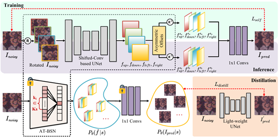 自监督去噪网络由于其无需干净图像即可训练的能力而受到了广泛关注。然而,真实世界场景中的噪声往往是空间相关的,这导致许多假设像素间噪声独立的自监督算法表现不佳。最近的研究试图通过下采样或邻域掩蔽来打破噪声相关性。然而,在下采样子图上进行去噪可能导致由于采样率降低而产生的混叠效应和细节丢失。此外,邻域掩蔽方法要么计算复杂度高,要么在推理过程中不考虑局部空间信息的留存率。通过分析现有方法,可以看出在现实世界的自监督去噪任务中获得高质量和纹理丰富的结果的关键是,在原始输入分辨率结构上训练,并在训练和推理期间使用非对称操作。基于此,CVPR 2024论文《Exploring Asymmetric Tunable Blind-Spots for Self-supervised Denoising in Real-World Scenarios》提出了非对称可调盲点网络(AT-BSN),其中盲点大小可以自由调整,从而在训练和推理期间更好地平衡噪声相关性抑制和图像局部空间破坏。此外,所提出方法将预训练的AT-BSN视为一个元教师网络,能够通过采样不同的盲点生成各种教师网络。训练时采用了一种基于盲点的多教师蒸馏策略,以蒸馏一个轻量级网络,显著提高性能。在多个数据集上的实验结果证明所提出方法达到了最先进的水平,并在计算开销和视觉效果方面显著优于其他自监督算法。