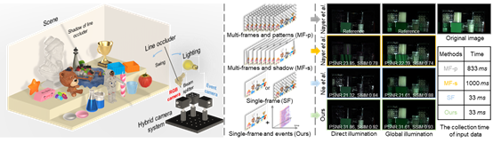 场景物体反射光照中包含直接光照和间接光照两部分,直接和间接光照的分离是计算机视觉中一个经典任务,可以提高形状恢复和物体材质估计等下游任务的准确度,例如光度立体视觉、结构光扫描等。当前直接和间接光照分离方法大多需要较长的数据拍摄时间,只能应用于静态场景,无法迁移到动态场景当中。现有单图方法虽然数据拍摄时间短,但由于缺少物理约束其分离效果较差。为了解决该问题,CVPR 2024论文《EvDiG: Event-guided Direct and Global Components Separation》(Oral)提出事件引导的直接和间接光照分离方法EvDiG,从单张传统RGB图像和对应记录阴影变化的事件信号实现直接和间接光照的分离。该方法利用事件相机高时间分辨率的特点,记录快速投射阴影变化下场景亮度的连续变化信息,从而获取场景光照物理约束,并以此实现场景直接和间接光照的分离。实验结果表明,在仅有单张图像和事件作为输入下,EvDiG在直接和间接光照分离效果上接近多图传统方法。通过控制光源遮挡物的快速运动,可以极大地缩短数据拍摄所需要的时间,达到单图RGB图像所需拍摄时间的水平。EvDiG可迁移到动态场景当中,实现动态场景下的直接和间接光照分离。