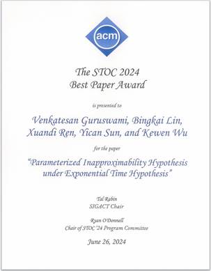 理论计算机科学顶级会议 STOC'24 近日公布论文录用列表,北京大学计算机学院博士生孙奕灿的论文《Parameterized Inapproximability Hypothesis under Exponential Time Hypothesis》被该会议录用并获得最佳论文奖(Best Paper Award)。这一系列工作源于孙奕灿与任轩笛在北京大学图灵班本科就读期间一起开始研究参数复杂性领域的不可近似性问题,两人在长期合作中,对参数复杂性下的最大团,最小集合覆盖,约束可满足问题的不可近似性都取得了重要理论结果,在理论计算机国际顶级会议ICALP、SODA、FOCS 和 STOC 上先后发表了四篇论文。除孙奕灿之外,本次获奖论文的作者还包括美国加州大学伯克利分校Venkatesan Guruswami教授、南京大学林冰凯教授、以及加州大学伯克利分校博士生任轩笛和吴克文。